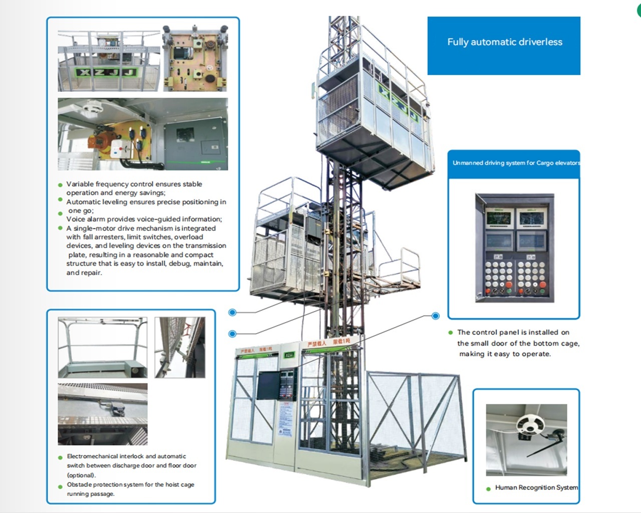Fully Automatic Driverless System: Equipped with frequency conversion control for smooth and energy-efficient operation. The system supports automatic leveling (one-time positioning), voice alarms, and voice broadcasting.
