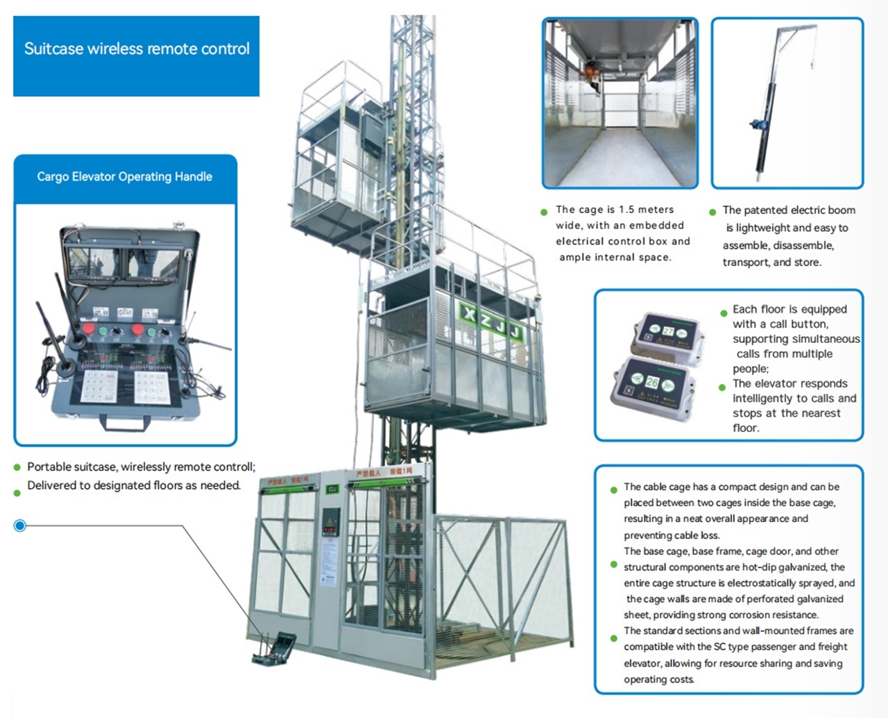 Optimized Structure: The cage has a width of 1.5m with an embedded electrical box, maximizing internal space. It utilizes a patented electric jib that is lightweight and easy to assemble/disassemble.